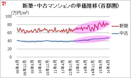 中古マンションの単価は3年ほど前から若干上昇傾向にはあるが、16年4月時点で46.5万円。新築の82.6万円の約6割でしかない。 平均築年数が約19年と築浅ではないマンションのデータではあるが、70m2に換算すると3,255万円。これなら庶民でも手が届くのではない…