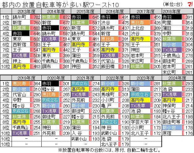 2013年度以降の都内の駅前放置自転車台数ワースト10の推移を次表に示す。